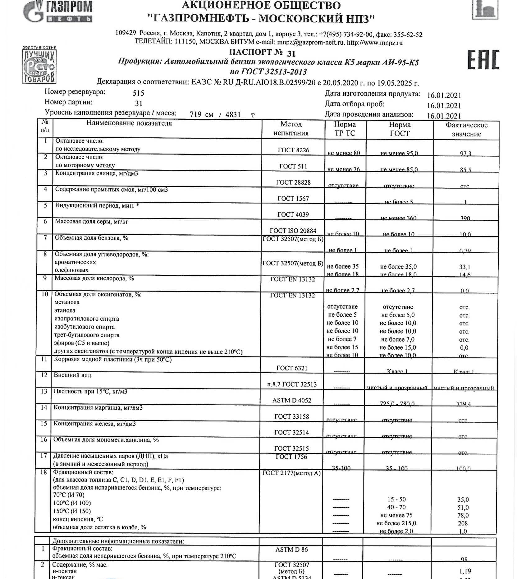 Выпуск БЕНЗИНА АИ-100 ЕВРО 5 (МНПЗ, ВЛПДС) осуществляется на современном оборудовании, с соблюдением требований нормативов, обязательным контролем качества и сертификацией.